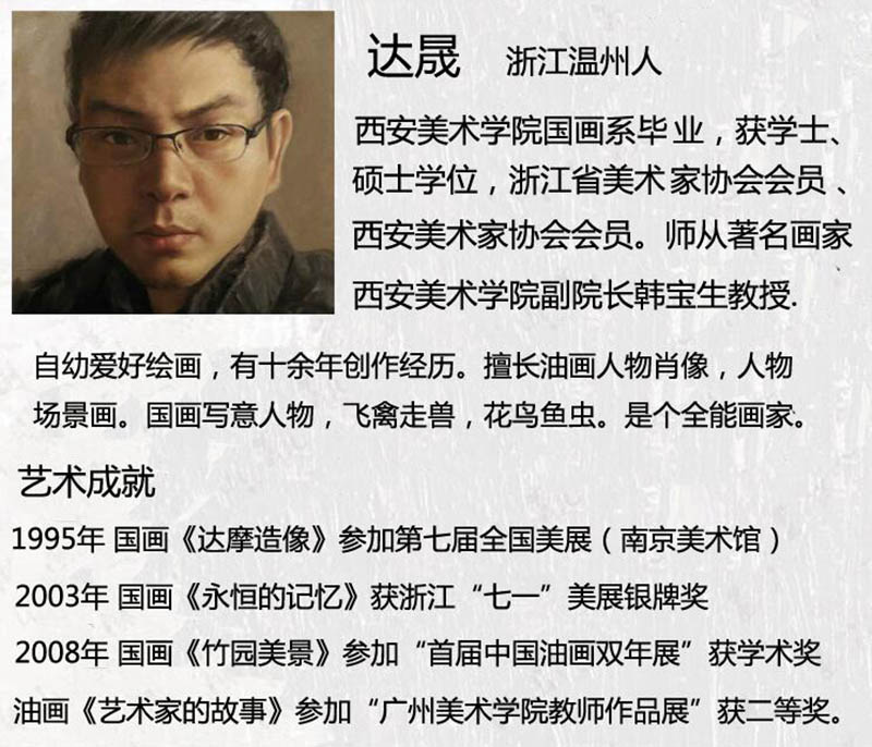 Da Sheng, 达晟,浙江温州人。西安美术学院国画系毕业,获学士,硕士学位。师从著名画家,西安美术学院副院长韩宝生教授。现为浙江省美术家协会会员,西安美术家协会会员。自幼爱好绘画,有十余年创作经历。擅长油画人物肖像,人物场景画,国画写意人物,飞禽走兽,花鸟鱼虫。是个全能画家。