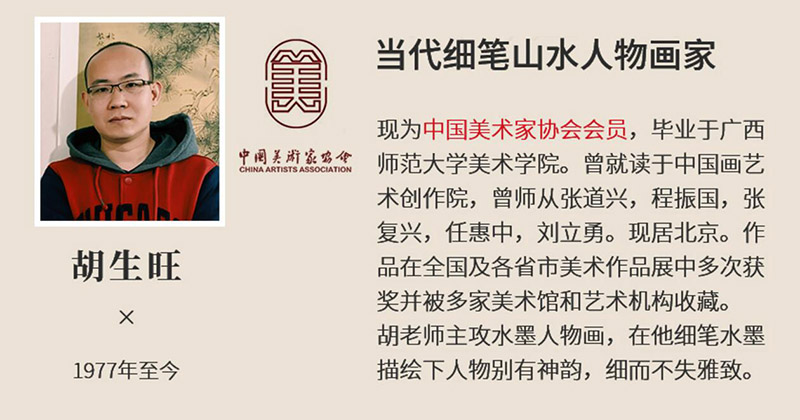 Hu Sheng Wang, 胡生旺,1977年出生,现居北京。现为中国美术家协会会员。当代细笔山水人物画家,毕业于广西师范大学美术学院。曾就读于中国画艺术创作院,师从中国著名的国画大师张道兴,程振国,张复兴,任惠中,刘立勇。