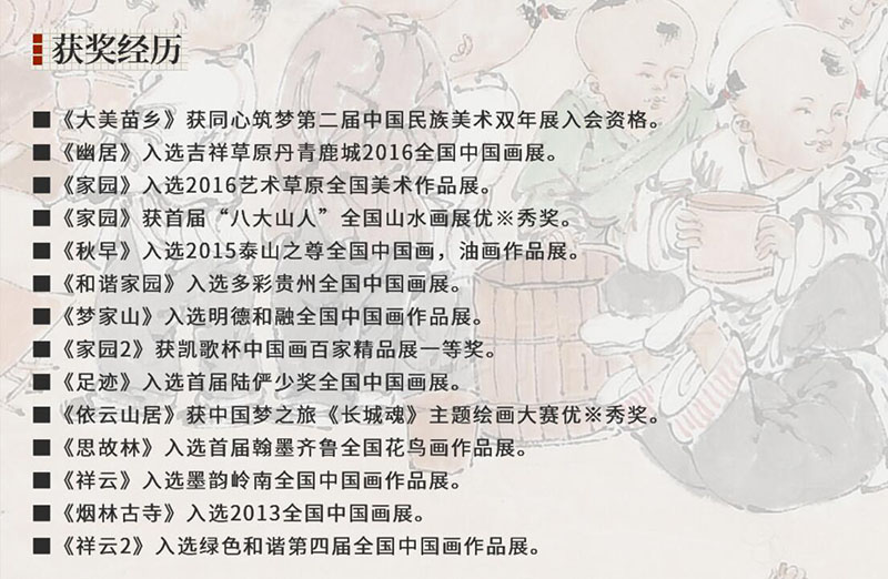 He specializes in ink figure painting. Under his fine ink painting, the characters have unique charm, exquisite without losing elegance.His works have won many prizes in national and provincial art exhibitions and have been collected by a number of gallery and art institutions.