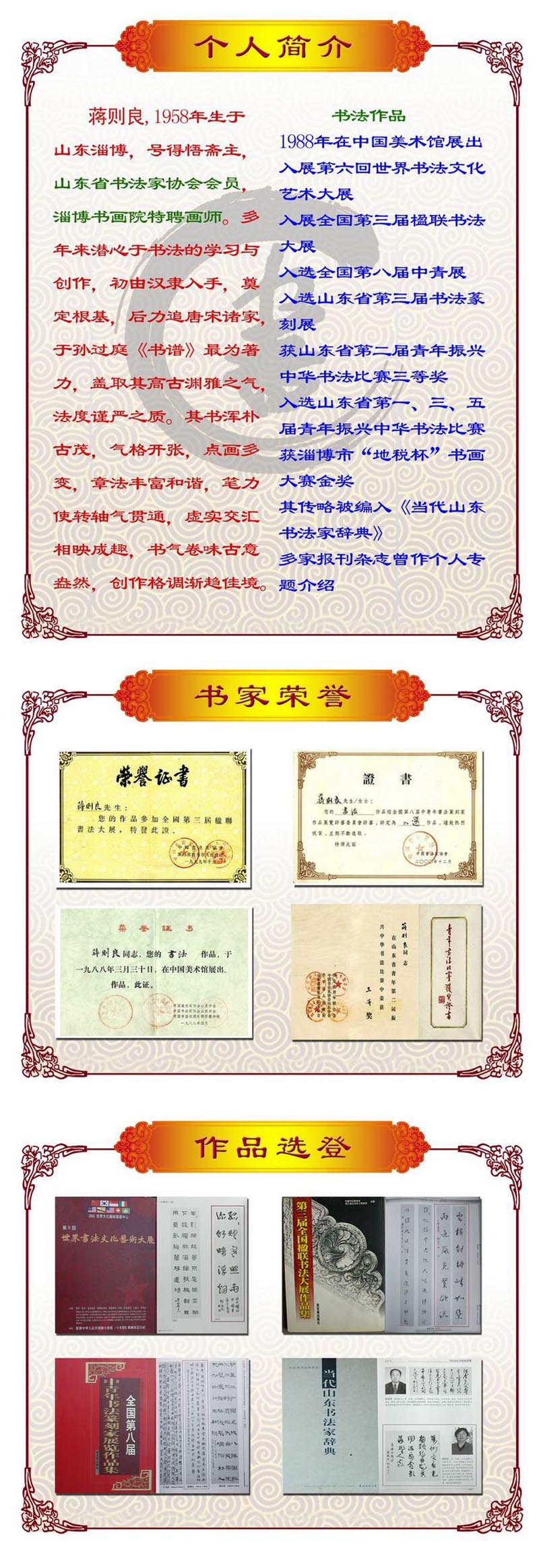 Jiang Ze Liang, 蒋则良,1958年生于山东淄博,号得悟斋主,山东省书法家协会会员,淄博书画院特聘画师,多年来潜心于书法的学习与创作,初由汉隶入手,奠定根基,后力追唐宋诸家,于孙过庭《书谱》最为著力,盖取其高古渊雅之气,法度谨严之质。1988年在中国美术馆展出入展第六回世界书法文化艺术大展,入展全国第三届楹联书法大展,入选全国第八届中青展,入选山东省第三阶书法篆刻展,获山东省第二届青年振兴中华书法比赛三等奖,入选山东省第一、三、五届青年振兴中华书法比赛获淄博市“地税杯”书画大赛金奖,其传略被编入《当代山东书法家词典》。多家报刊杂志曾作个人专题介绍。