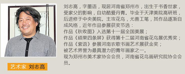 Liu Zhi Gao, 刘志高,字墨雨,现居河南省郑州市。出生于书香世家,受父亲的影响,自幼酷爱丹青。毕业于天津美院高研班,后进修于中央美院。主攻花鸟,尤其是工笔,其作品逐渐自成风格。被艺术界誉为最具潜力的青年画家之一。现为郑州市美术家协会会员,河南省花鸟画研究院协会会员。