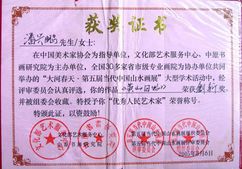2002年,作品《泰山日出》参加“中韩碑林中国杯大展”获优秀奖;2004年元月,参加桂林美术院、香港中国美术会举办的联合展,作品《黄山日出》荣获银奖。并出版有《潘兴鹏画集》;