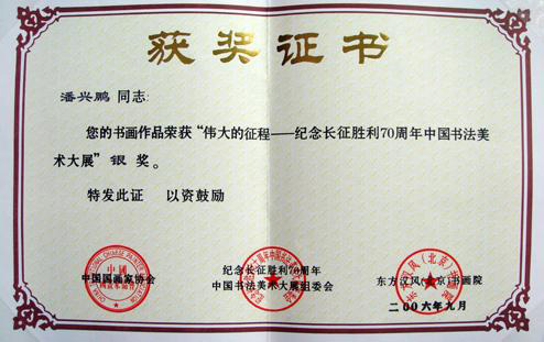 2006年,作品《老山界》参加“伟大的征程-纪念长征胜利70周年中国书法美术大展获银奖;