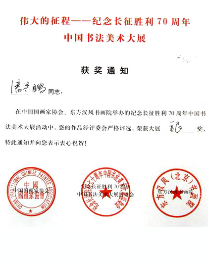 In 2006, "Laoshan Bound" won the Silver Award in the “The great journey-the China Calligraphy and Painting Exhibition to celebrate the 70th anniversary of the victory of the Long March”.